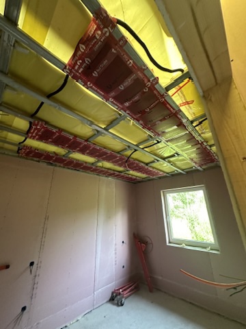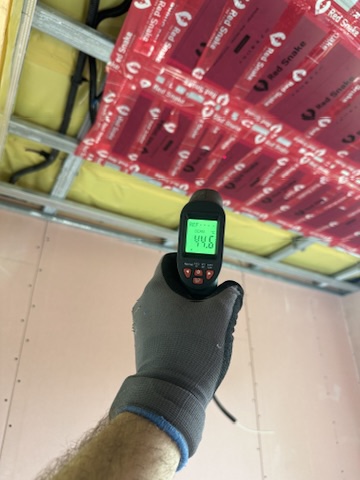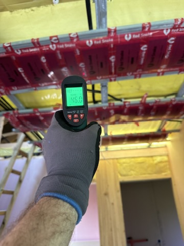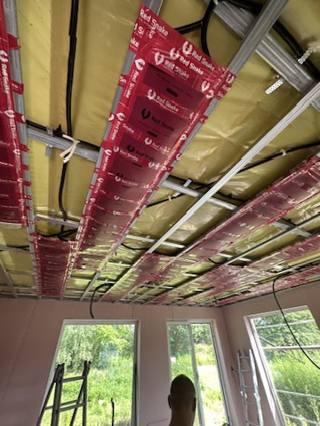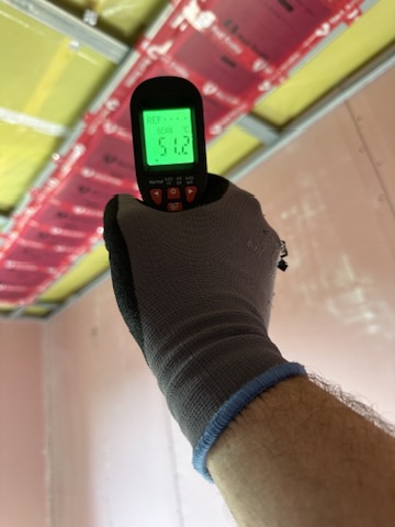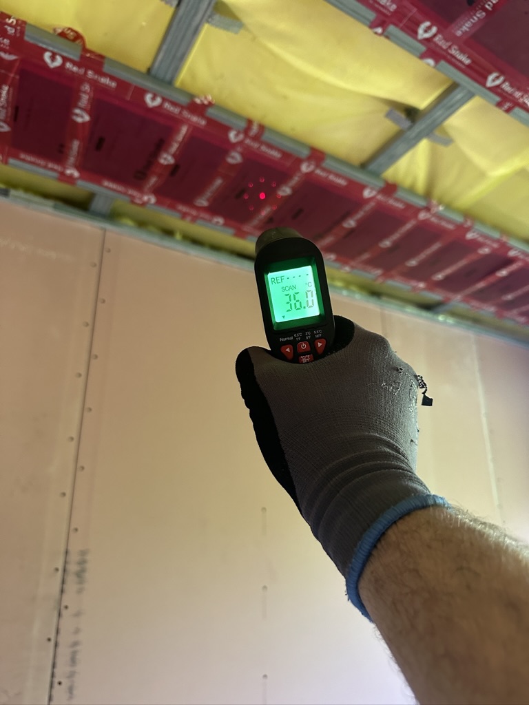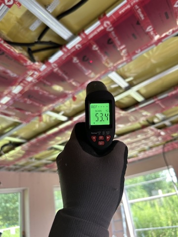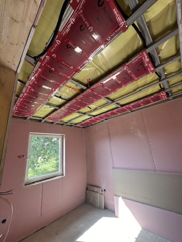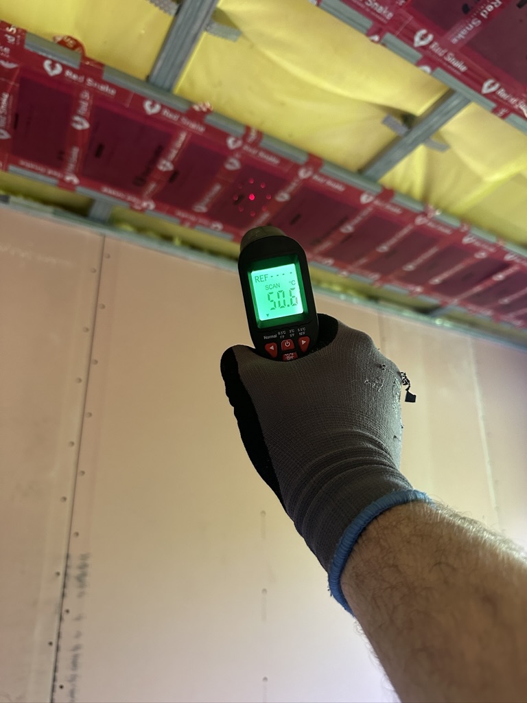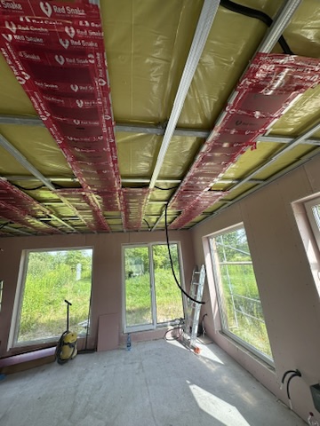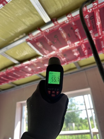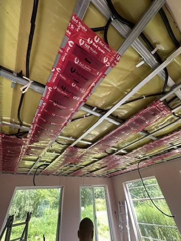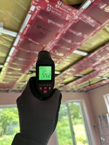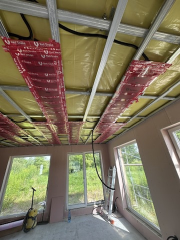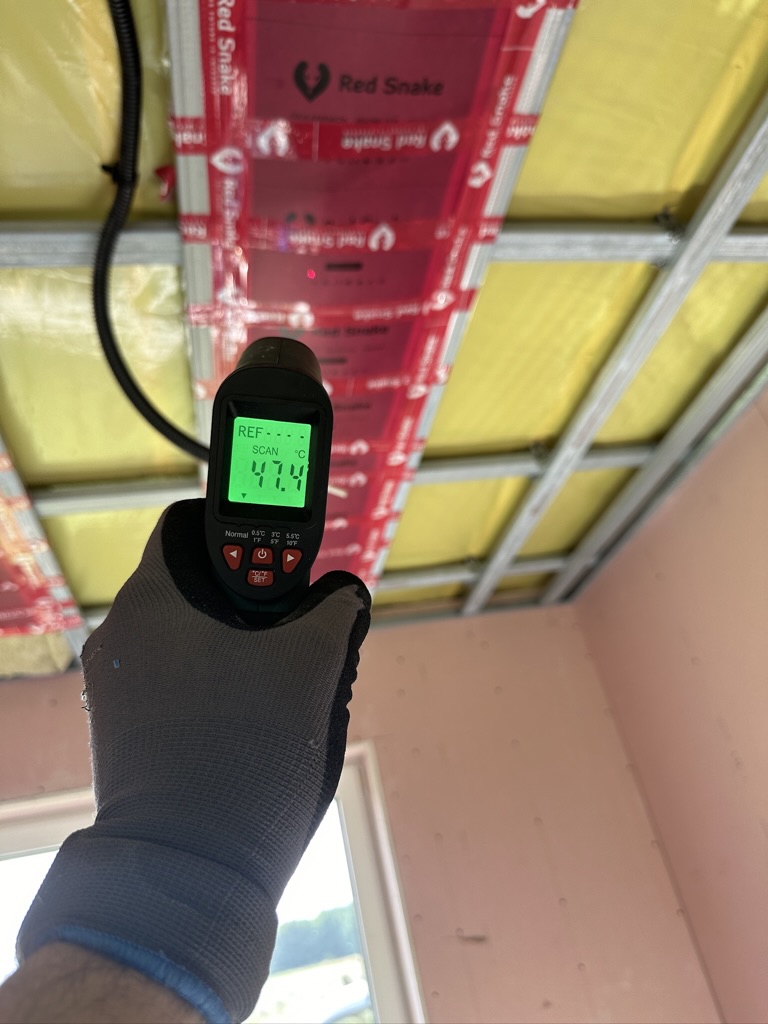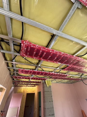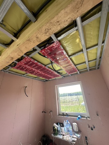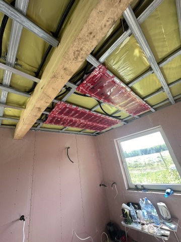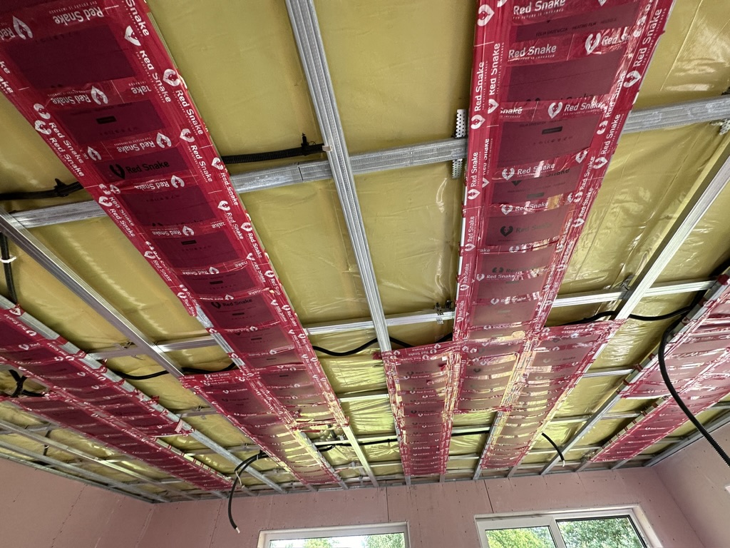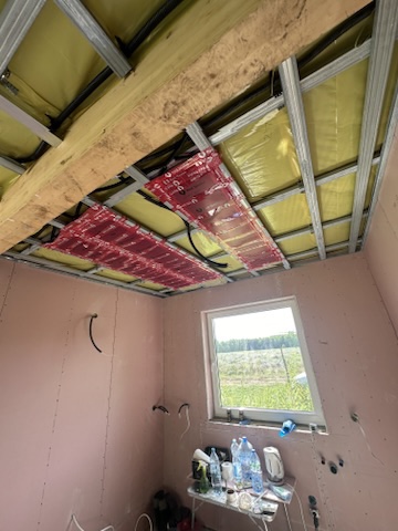 Został wykonany system grzewczy oparty na foliach grzewczych montowanych w suficie oraz sterowaniu termostatami z możliwością zadalnego zarządzania. Zastosowane folie grzewcze Red Snake 150Wm2 oraz termostat NVT 10 Novli