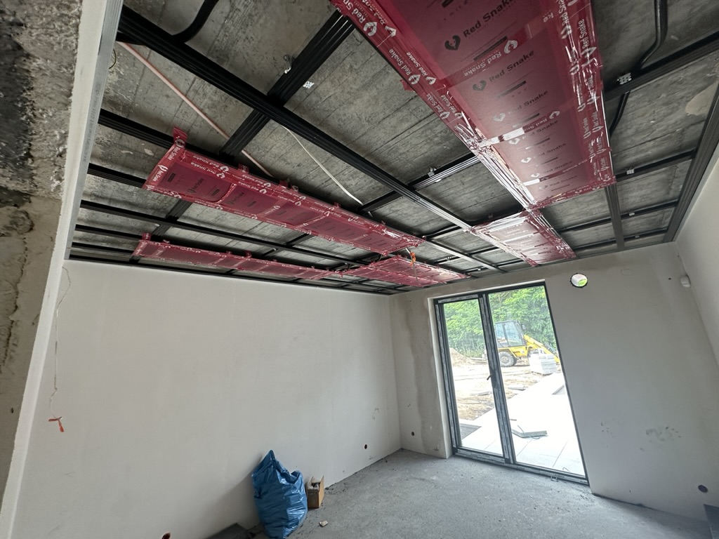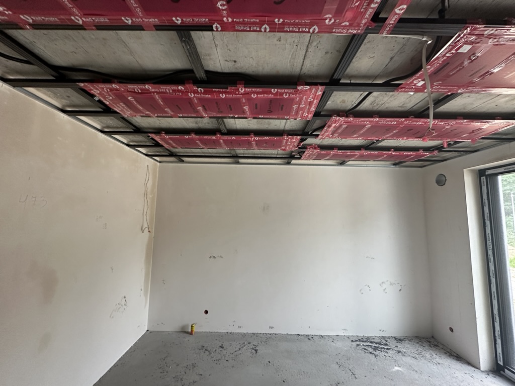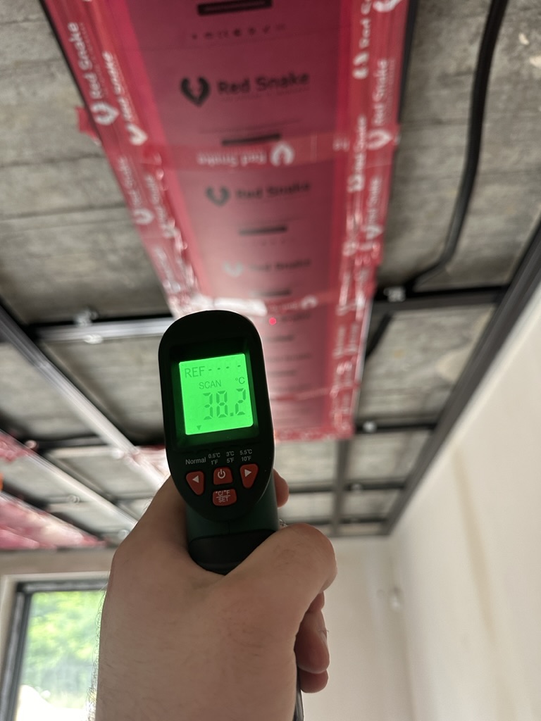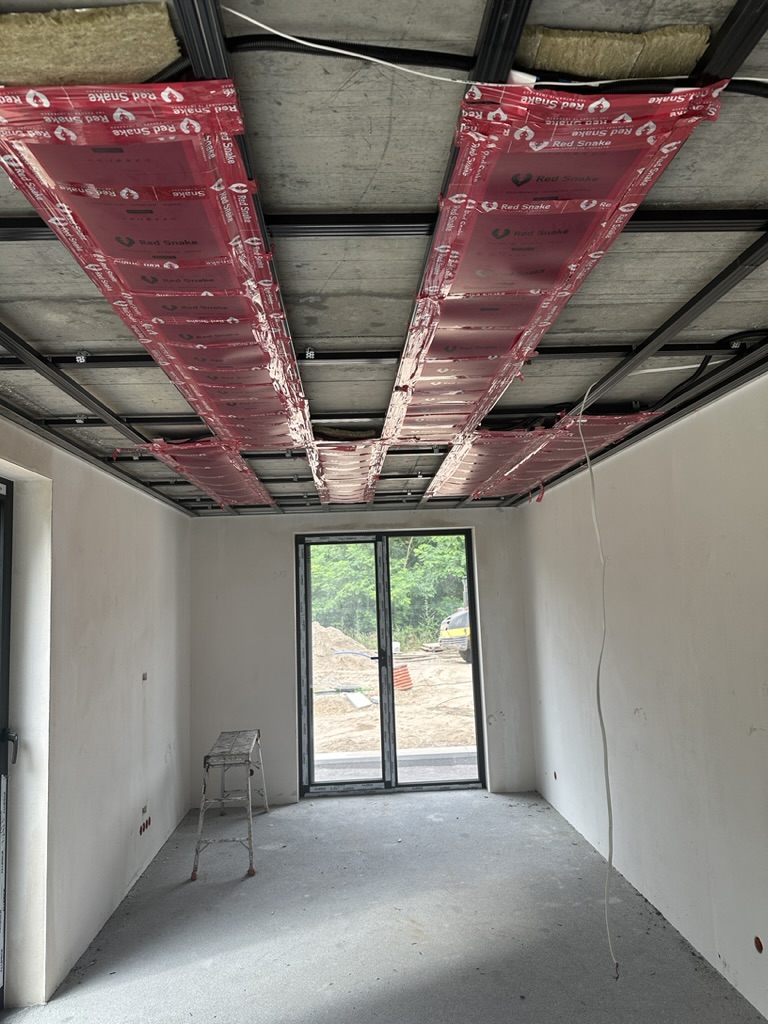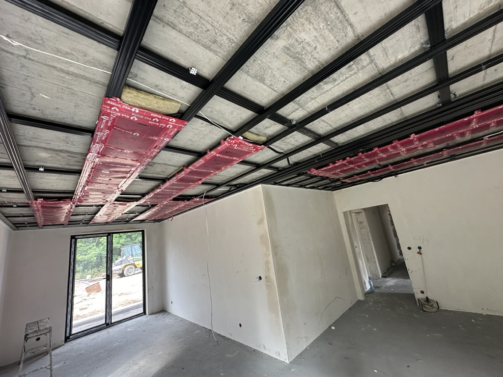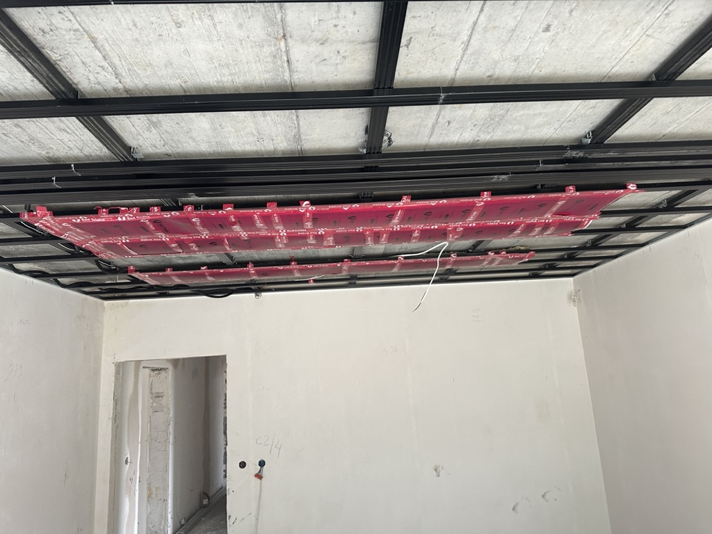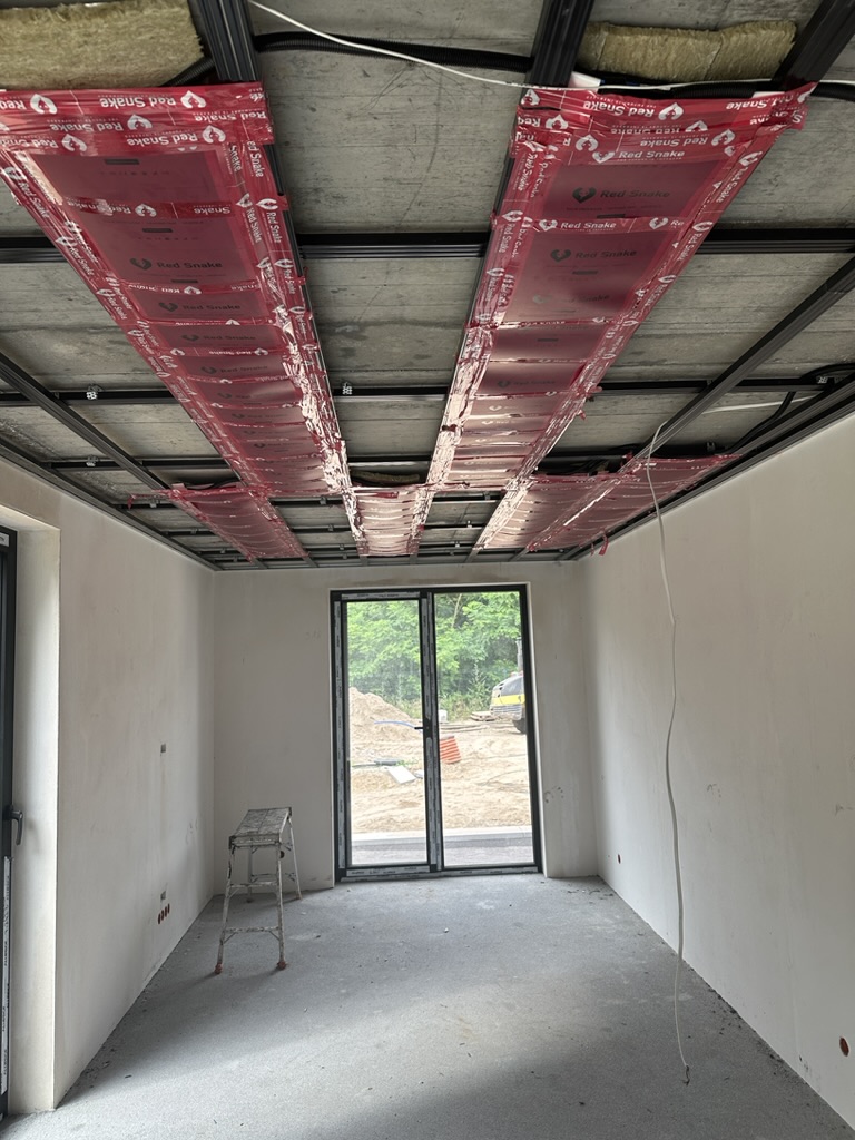 Ogrzewanie sufitowe w Świebodzinie dom ok 300m2 w systemie hybrydowym. Zastosowane folie grzewcze Red Snake 150Wm2 podłoga, 400Wm2 sufit.